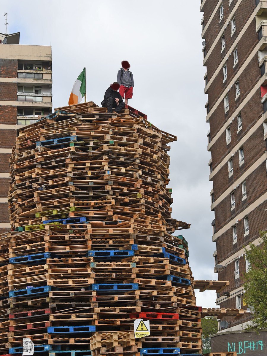 Exceptional scenes in north #Belfast as two youths protesting on top of New Lodge bonfire order themselves a Deliveroo - who was then turned away by police 😮 (Pics via @NorthBelfastNew) pic.twitter.com/vSuYDnfzer