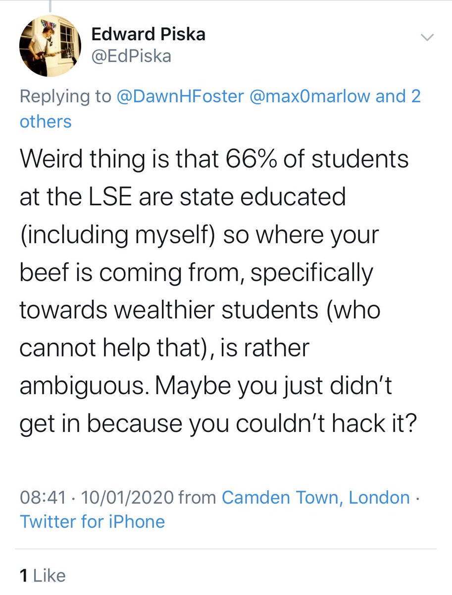 Hi Maxwell! You @ed me in so complaining about me replying is idiocy. And 92% of people are state-educated so you knowing one person means nothing. But do tell me again how a tweet clearly about how harrowing the justice system can be was funny to you!