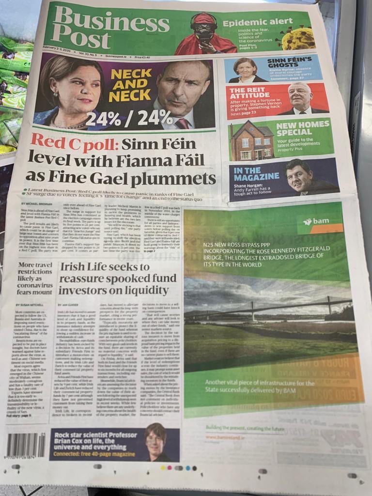 Heard from three sources there’s a Sunday Business Post/Red C poll that puts Fianna Fáil 24, Sinn Féin 24, and Fine Gael 21.