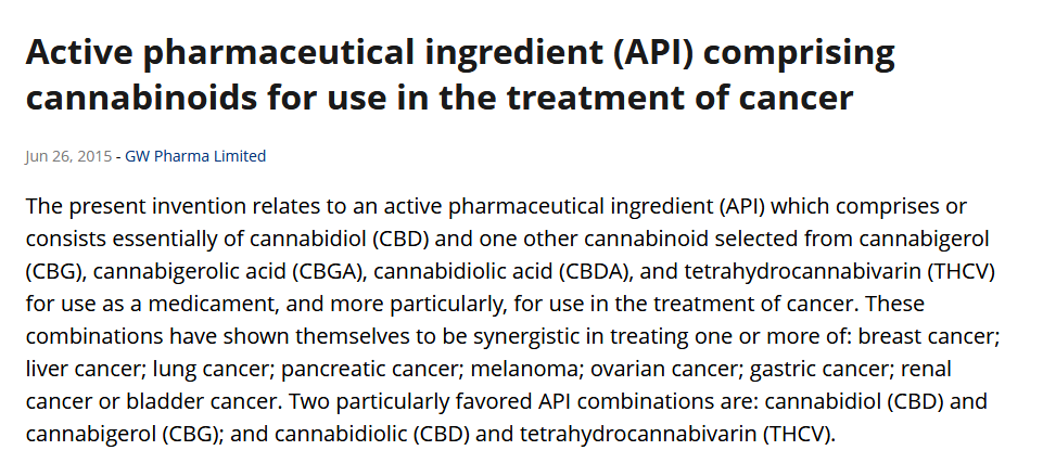 "Cannabinoids for use in the treatment of cancer. ... Overall this study demonstrated that when CBD is combined with other phytocannabinoids they have the potential to act synergistically on the viability of a number of different cancer types." https://patents.justia.com/patent/9962341 pic.twitter.com/U85sYYGCiN