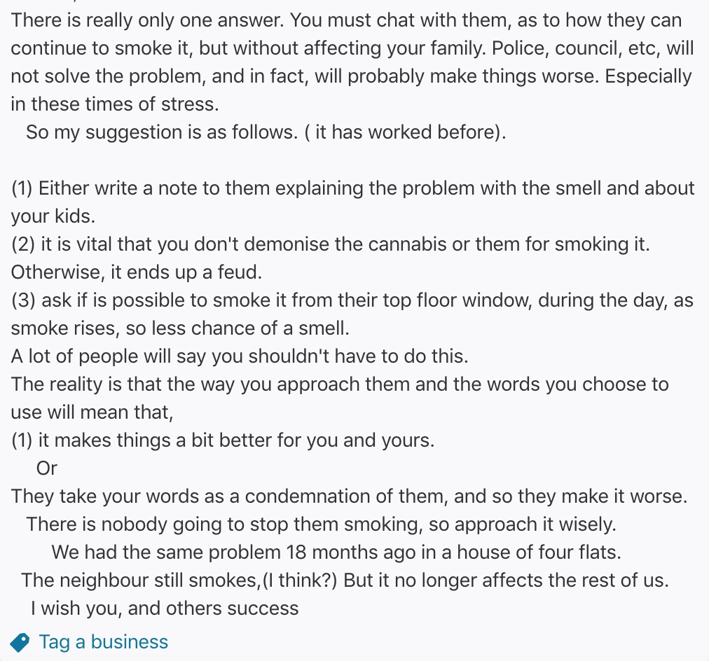 Pleased to report the Nextdoor post “My neighbours smoke weed and I hate it, what should I do?” has exclusively yielded answers saying “DON’T call the police/council, here is a cautious, non-confrontational way to speak to them about mitigating the smell.”