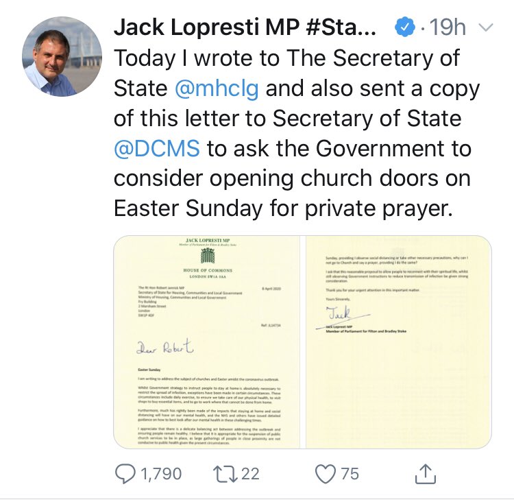 As a church-going Catholic - shut up. The priests don’t want to open the churches unless they hate their congregation so much they want to kill them. Do what the hashtag in your name says.https://twitter.com/JackLopresti/status/1247894726486798342 …