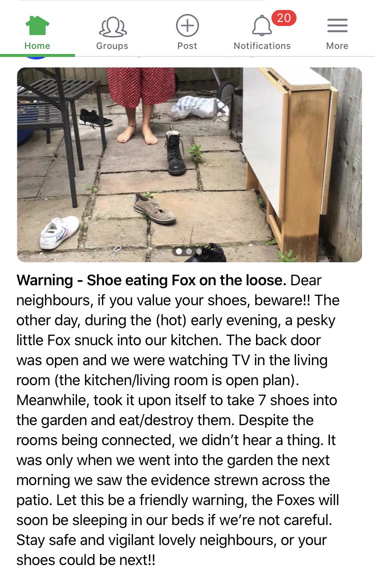 Thank you NextDoor for warning me about “a shoe-eating fox on the loose.”