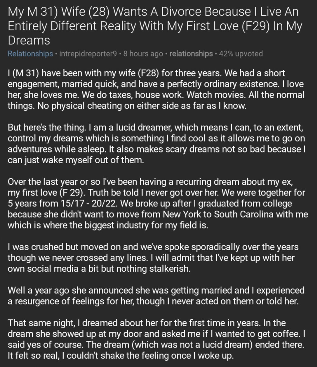 He seems to have quickly glossed over the fact he admits he never got over this woman, and that that might be the big problem not “Oh, I had some dreams”https://twitter.com/redditships/status/1351233355581431808 …