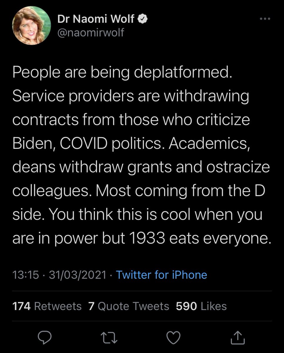 Having your Covid disinformation tweets taken down is the same as the Nazis taking power, you heard it here firstpic.twitter.com/5tAPyxcFsO
