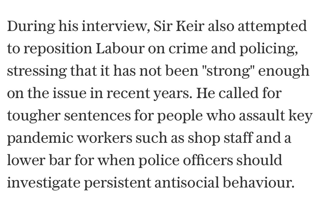 I read the whole Telegraph interview and Starmer’s entire plan is just to put more people in prison, he doesn’t care about Brexit now, and he hasn’t spoken to Corbyn for five months.pic.twitter.com/Z27l1zp7k7