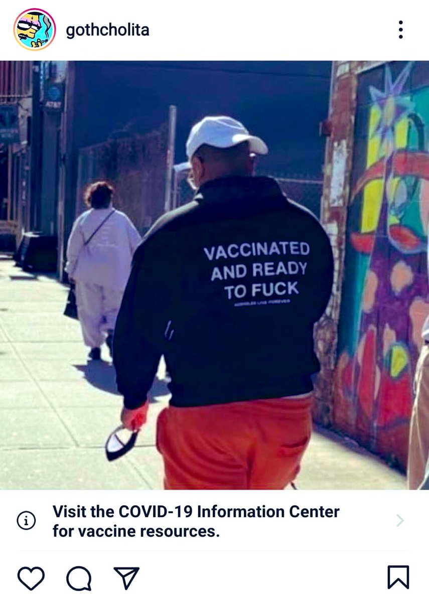 UPDATE. @PeterWebber discovered it says “assholes live forever” https://lindafinegold.com/products/vaccinated-and-ready-to-fuck-black-hoodie …