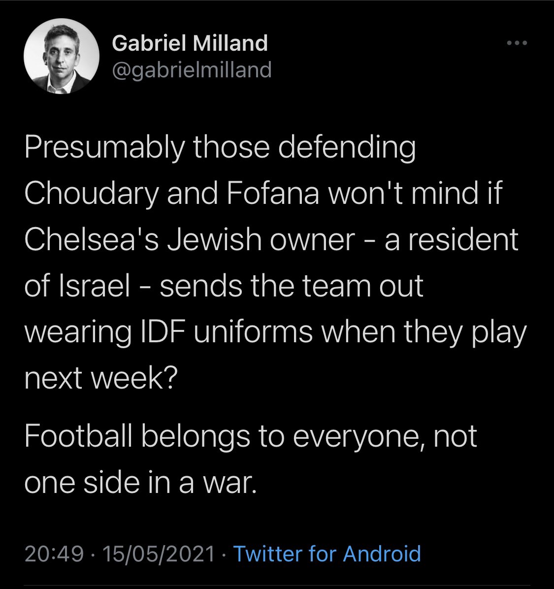 Abramovich finances the groups that steal Palestinians' homes. The Chelsea kit may as well be an army uniform and the IDF a natural progression from their NF and Combat 18 leanings of the last generation.