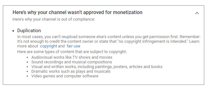 If your channel is out of compliance due to duplication, this typically means that the content is auto-generated. Our Creator Support team may be able to share more with you, contact them here: https://goo.gl/MidyGJ