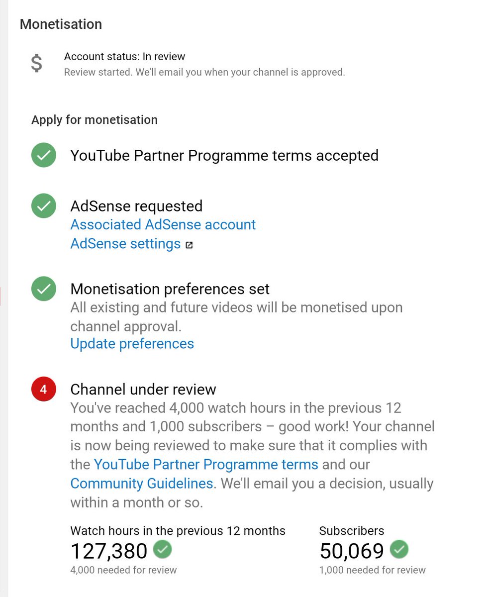 Hello Youtube Team Please help me. My channel got 50k subscribers and 127k+ watch hours but it is still in review.Its an educational channel,no copyright strike or no guideline strikes.Please monetize it.