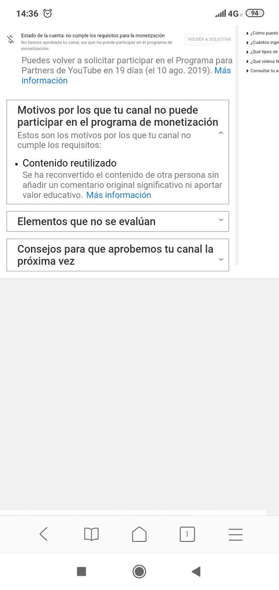 Hola. Gracias por la imagen. ¿Podrías enviarnos otra del mismo menú con el recuadro "Motivos por los que tu canal no puede participar en el programa de monetización" desplegado? Queremos echar un vistazo para orientarte mejor. Quedamos a la espera.