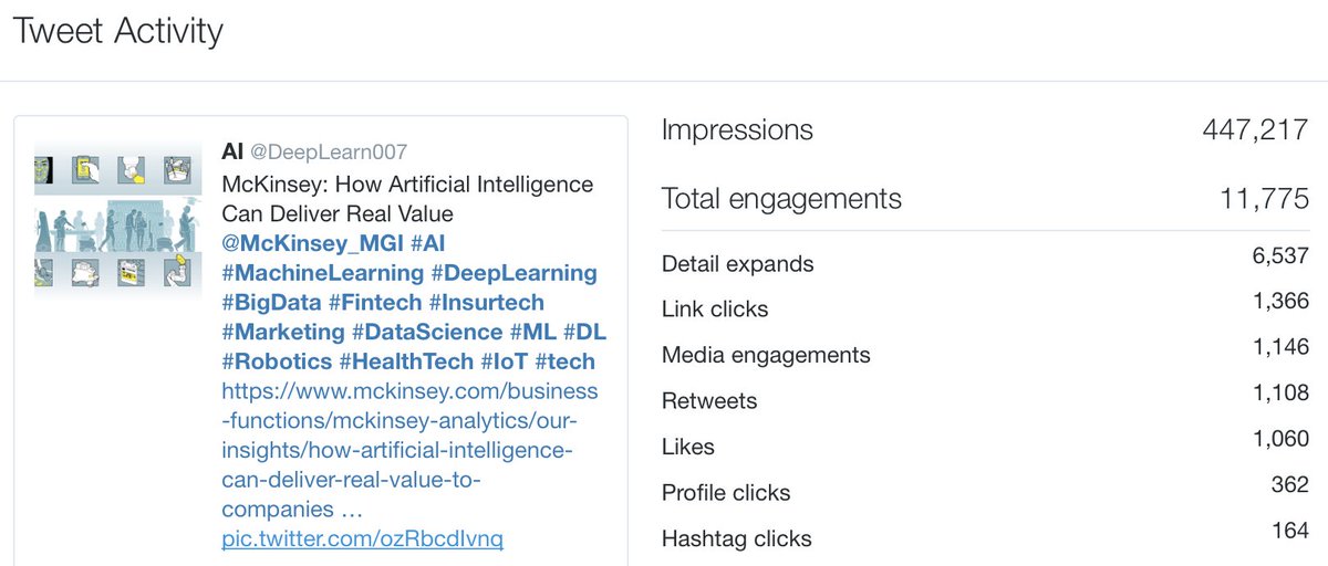 @DeepLearn007 for continually educating the#AI marketplace. Beyond generating high RTs, your link clicks illustrate that people open your insights. They are engaged and obviously like what you share.#Influencer@BrettKing@SpirosMargaris@psb_dc@jaypalter@guzmandhttps://twitter.com/DeepLearn007/status/1018855481329311744 …