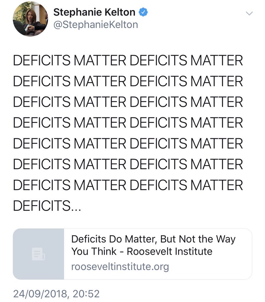 Just a reminder: Modern Monetary Theoy IS NOT saying that deficits don't matter.https://twitter.com/MMTpodcast/status/1080595019122262016 …