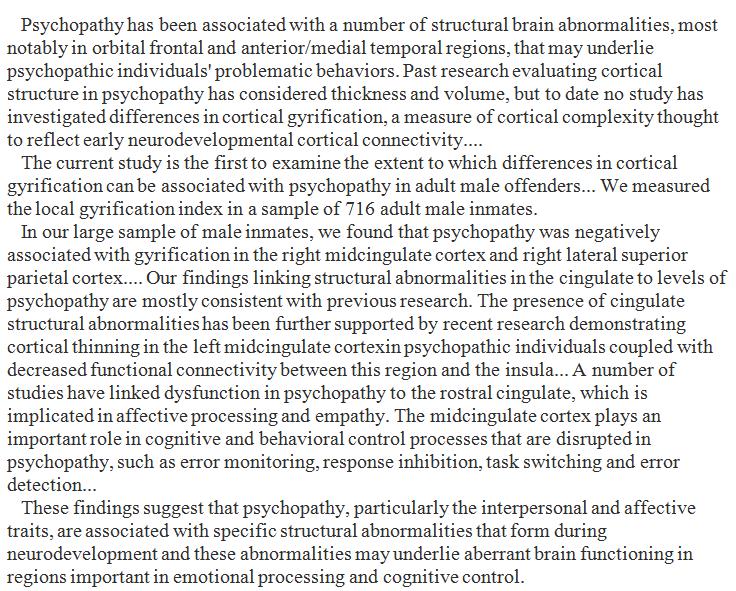 Criminal psychopaths showed signs of reduced gyrification, the creation of the characteristic folds, in critical structures of the cortex. https://www.sciencedirect.com/science/article/pii/S2213158218301906 …pic.twitter.com/bMubVVsNe7