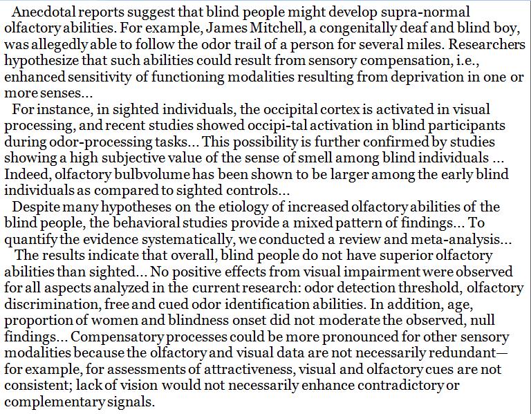 Meta-analysis: Against earlier suggestions, the blind do not have any keener sense of smell than the sighted. https://link.springer.com/article/10.1007/s00426-018-1035-2 …pic.twitter.com/sVsFjW4cGZ