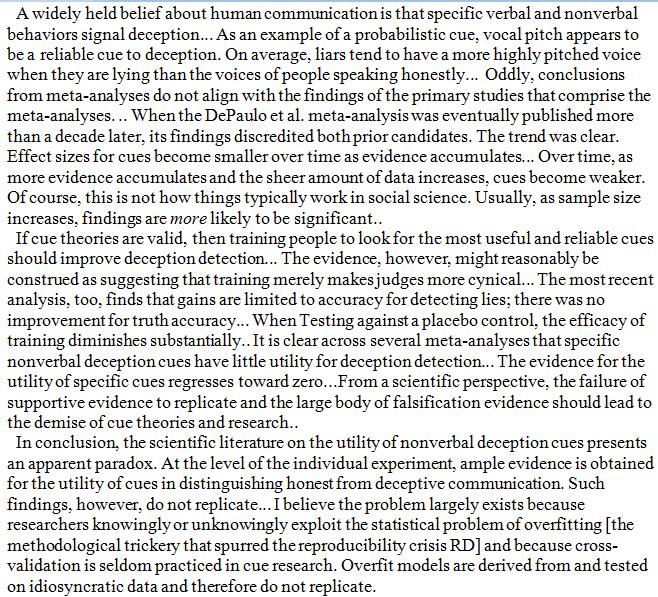 Psychology has deceived itself and the public into believing that there are reliable cues to deception - which there aren't. http://ijoc.org/index.php/ijoc/article/view/7838 …pic.twitter.com/4kQAKWJj9k