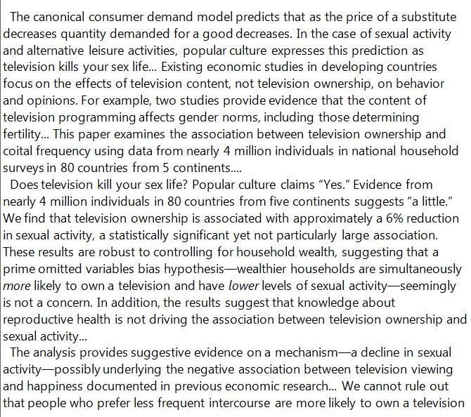 "Television ownership is associated with approximately a 6% reduction in the likelihood of having had sex in the past week." http://www.nber.org/papers/w24882 pic.twitter.com/gUVzhNtpxX