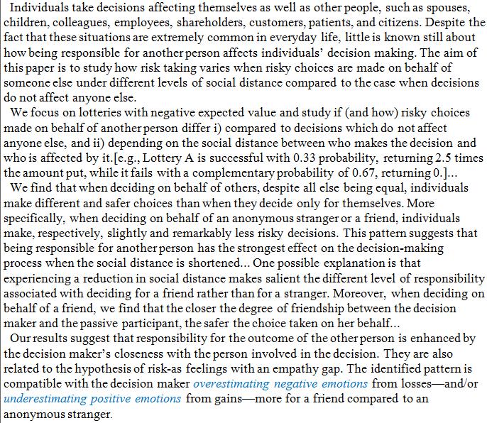 When making decisions for others, people take fewer risks. https://link.springer.com/article/10.1007/s11166-018-9286-2 … Reflecting our greater ability to feel others' pain than their gain: https://plus.google.com/101046916407340625977/posts/6uLTcytdvse …pic.twitter.com/FAch7SeVYm