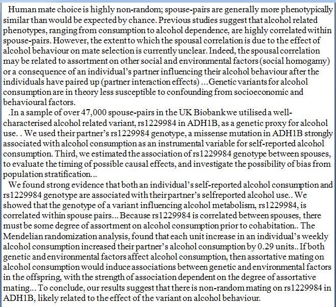 Birds of a feather drink together. Husband and wifes tend to resemble each other in a genetic disposition that effects alcohol use. https://www.biorxiv.org/content/early/2018/09/14/418269 …pic.twitter.com/8VphSM50Jl