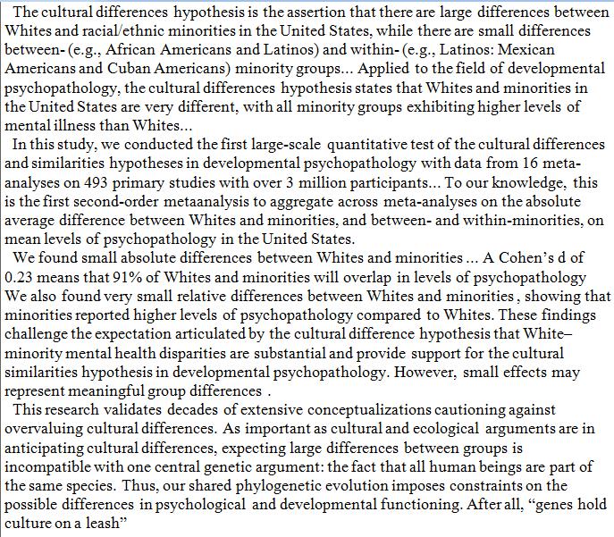 There are only small differences in the levels of mental illness between Whites and minorities in the US. https://www.cambridge.org/core/journals/development-and-psychopathology/article/are-whites-and-minorities-more-similar-than-different-testing-the-cultural-similarities-hypothesis-on-psychopathology-with-a-secondorder-metaanalysis/B7C6E3EB9ED1ADD3C52CFB119BC216B8 …pic.twitter.com/y0ln7k8bQz