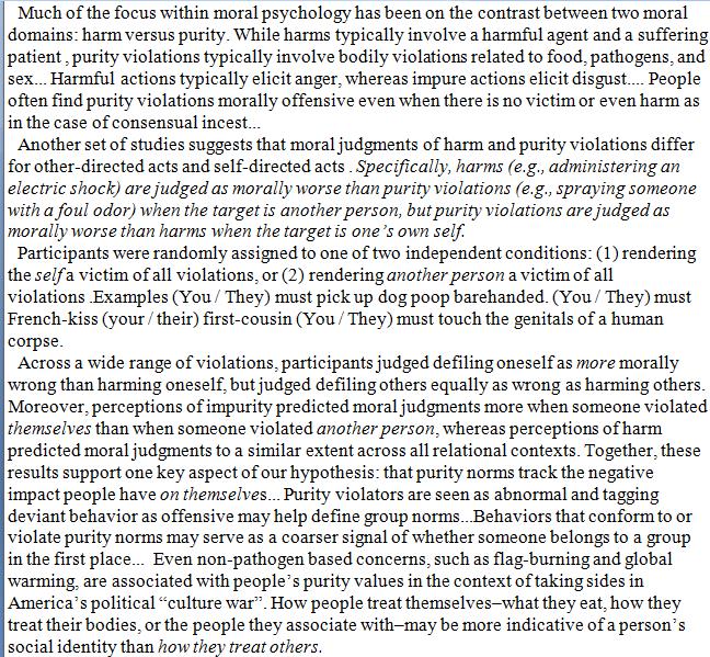 Suppose people believe that others are selfish and are more willing to damage other's purity than their own. Then if they see someone violate their own purity, they might deduce that they must be willing to do something even worse to others.
