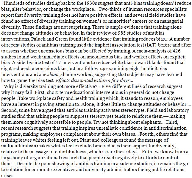 Six: people's existing biases are a result of a lifetime of learning. Anti-bias training is attempting to override that in an afternoon. A person would have to possess a non-functioning intellect to allow that to happen to any knowledge set.