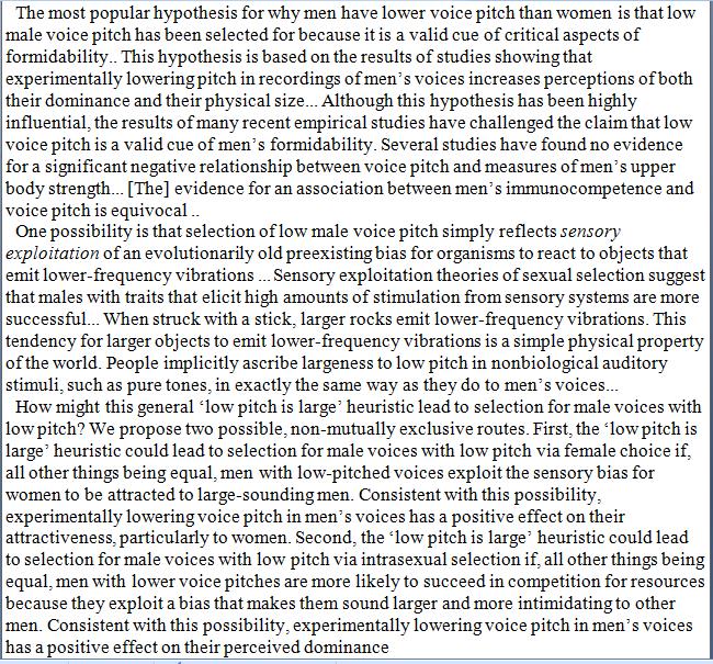 Interesting there’s no mention of the negative correlation of voice pitch and testosterone production