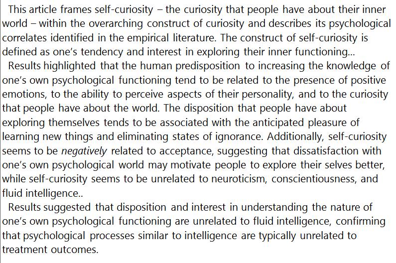 Self-curiosity, the psychology-drive to explore one's inner functioning, is borne out of dissatisfaction with one’s own psychological world. https://www.tandfonline.com/doi/full/10.1080/15298868.2018.1543728 …pic.twitter.com/pDgzeTxCIE