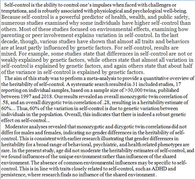 Meta-analysis: "60% of the variation in self-control is due to genetic variation between individuals in the population." https://www.sciencedirect.com/science/article/pii/S0149763418307905 …pic.twitter.com/iS8WuS5veA