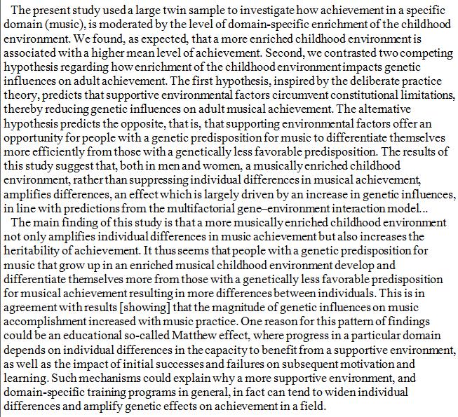 Growing up in a musically enriched environment led to greater musical achievement - but by magnifying individual differences and the heritability of the accomplishment. https://psycnet.apa.org/record/2019-14504-001 …pic.twitter.com/RntlmrOmNf