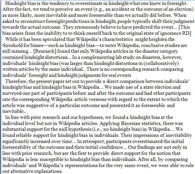 Wikipedia 20/20: The online encyclopedia is less prone than individuals to the "knew-it-all-along effect", the self-delusion that one saw things coming. https://link.springer.com/article/10.1007/s00426-019-01165-7 …pic.twitter.com/0f686cyL56