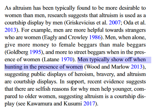 Interesting read. I can’t help but agree more with the fact that altruism is displayed by men as a means to attain courtship in most cases