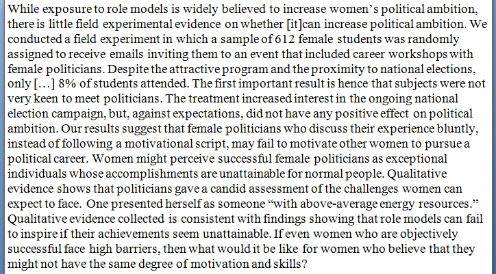 Not an objective comment. Better one: Exposure to positive gender role models failed to increase women's political ambition due to the perceived inattainability of the role