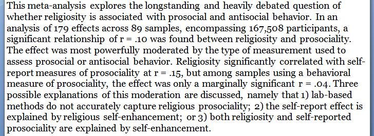 Meta-analysis: Religiosity only systematically correlated with self-reports of prosocial behavior, not with behavioral measures. https://escholarship.org/uc/item/74r7n99q … All you ever wanted to know about (dis)belief in god and prosocial behavior: https://drive.google.com/file/d/1kpz3AHmUkA3RKnCzupA-_QynA8zO3xnY/view …pic.twitter.com/KfXW5VKJVd