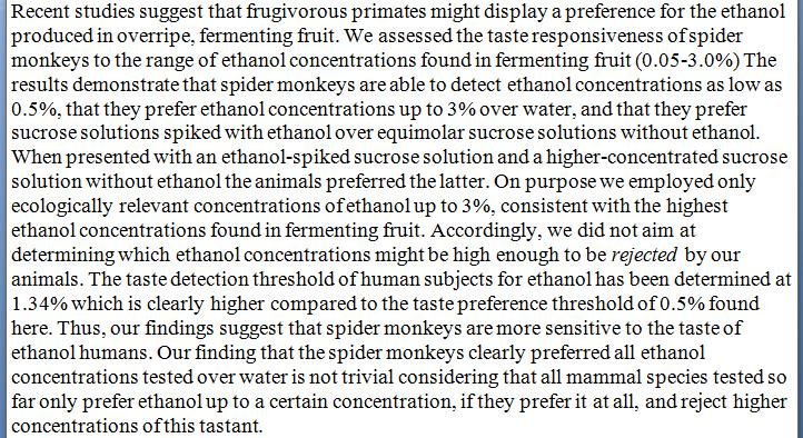 "Thus, our findings suggest that spider monkeys are more sensitive to the taste of ethanol humans."