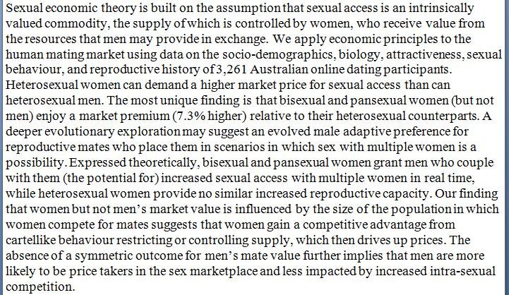 Bisexual and pansexual women enjoy a market premium (7.3% higher) on the mating market, holding out the prospect of added value to men. https://www.tandfonline.com/doi/abs/10.1080/00036846.2019.1650886 …pic.twitter.com/0tsyO5Moua