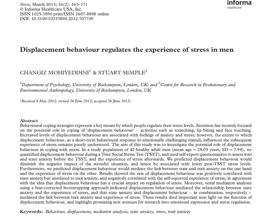 We believe that fidgeting (we would call it ‘displacement behaviour’) does have a very clear function – stress regulation (https://www.tandfonline.com/doi/abs/10.3109/10253890.2012.707709 …). Interestingly, there appears to be a sex difference in this function…works for men, but not women (https://journals.plos.org/plosone/article?id=10.1371/journal.pone.0056355 …).pic.twitter.com/htDzprooKp