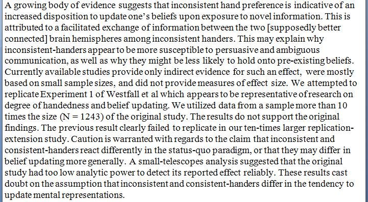 Psychology finding indicating that mixed-handers are more mentally flexible, more readily updating their beliefs upon exposure to new evidence, goes down the drain in failed replication. https://www.collabra.org/articles/10.1525/collabra.227/ …pic.twitter.com/CAcesPAGsL
