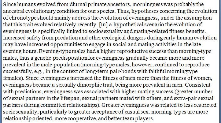Evening types ("owls") my also be evolutionary late-comers, possibly owing their existence to the invention of fire. https://www.researchgate.net/profile/Coltan_Scrivner/publication/333815745_Morningness-Eveningness_and_Sociosexuality_from_a_Life_History_Perspective/links/5d070db492851c900442d4ff/Morningness-Eveningness-and-Sociosexuality-from-a-Life-History-Perspective.pdf …pic.twitter.com/5rUnzApTRu