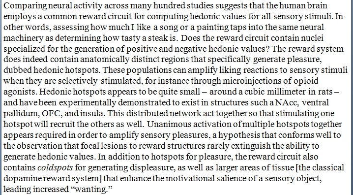 "How much I like a song or a painting taps into the same neural machinery as determining how tasty a steak is." And it's a distributed network of tiny hot spots that must fire unisono to ensure sensory enjoyment. https://www.oxfordhandbooks.com/view/10.1093/oxfordhb/9780198824350.001.0001/oxfordhb-9780198824350-e-7 …pic.twitter.com/OxugQk621t