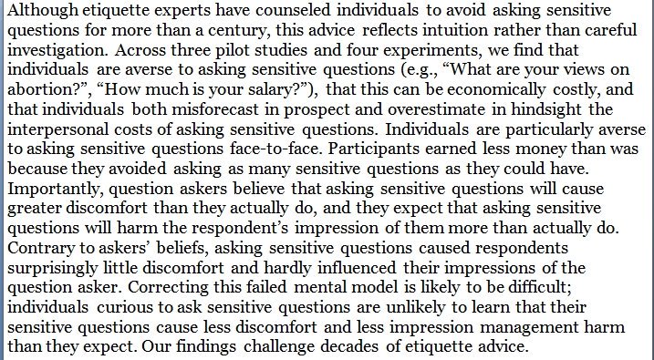 People are aversive to asking sensitive questions, falsely expect interpersonal drawbacks, and willingly incur costs for not having to ask. https://papers.ssrn.com/sol3/papers.cfm?abstract_id=3437468 …pic.twitter.com/6QA4Ykh7Fx