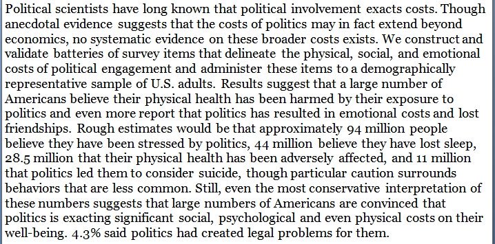 A large number of Americans believe exposure to politics has hurt their health, their emotional life, and their friendships. https://journals.plos.org/plosone/article?id=10.1371/journal.pone.0221870 … Related: Politics damages reasoning ability https://twitter.com/DegenRolf/status/966000707961872384?s=20 …pic.twitter.com/tu4YewdoSP