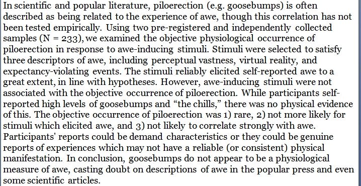 Contrary to the psychological literature, reports in the popular media, and people's subjective impressions, awe-inducing stimuli did not elicit goosebumps. https://osf.io/72j4w/ pic.twitter.com/su7gglweyE