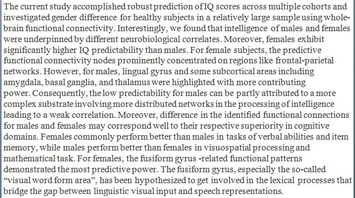 Intelligence of males and females were underpinned by different neurobiological correlates, with female IQ better predictable from brain measures because of more circumscribed location. https://academic.oup.com/cercor/advance-article/doi/10.1093/cercor/bhz134/5540233#138440938 …pic.twitter.com/TtR2YSYe9J