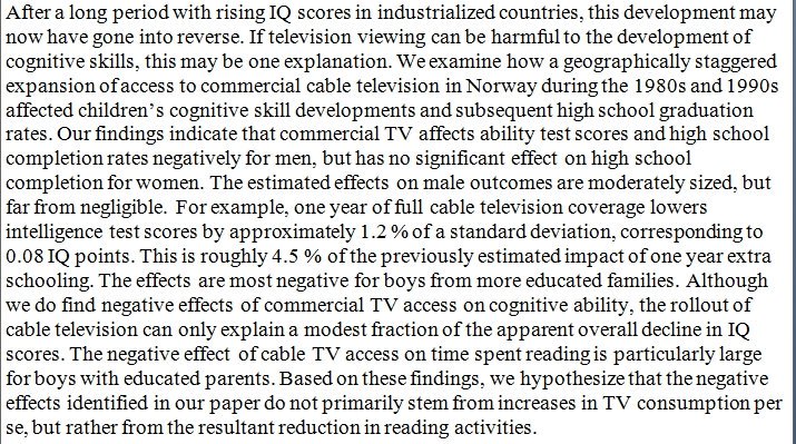 Massive expansion of commercial cable television made boys a bit dumber, but had no effect on girls. http://jhr.uwpress.org/content/54/2/371.short …pic.twitter.com/blyUDXywbm
