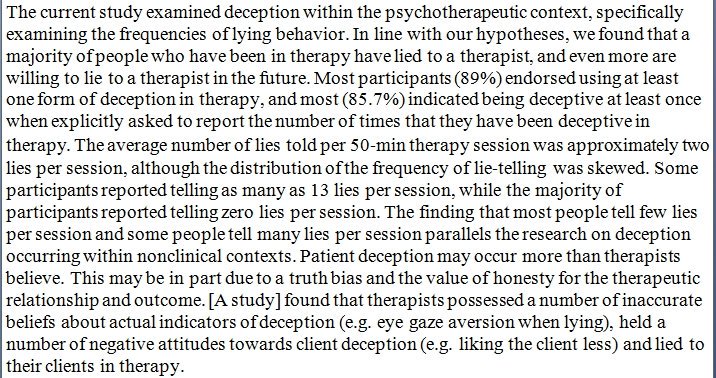 The average number of lies told by clients per psychotherapy session was approximately two, while some reported telling as many as 13 lies per session. https://onlinelibrary.wiley.com/doi/full/10.1002/capr.12263 …pic.twitter.com/n98uF43HH6