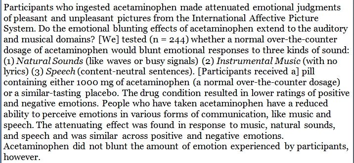 Popular painkiller blunts the ability to perceive emotions in music and other forms of acoustical communication. https://www.lindsaywarrenburg.com/acetaminophen pic.twitter.com/Sa40lID6qb