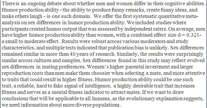 First-time meta-analysis: Men are better at producing humor than women. https://www.sciencedirect.com/science/article/abs/pii/S0092656619301072 …pic.twitter.com/Mjw0rJYLEr