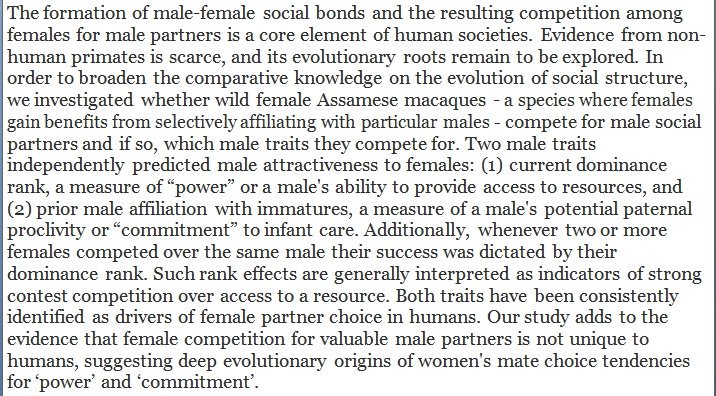 Female macaques compete among each other for males with qualities that seem strangely familiar: Rank and paternal commitment. https://www.sciencedirect.com/science/article/abs/pii/S1090513819301199 …pic.twitter.com/dzbTIDEDxz