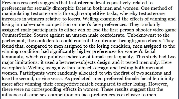 After winning a competition, men showed higher preferences for women’s facial femininity, while women's preferences remained unchanged. http://ishe.org/wp-content/uploads/2019/09/2019-ISHE-SI-programme.pdf …pic.twitter.com/oGAYC90nEt